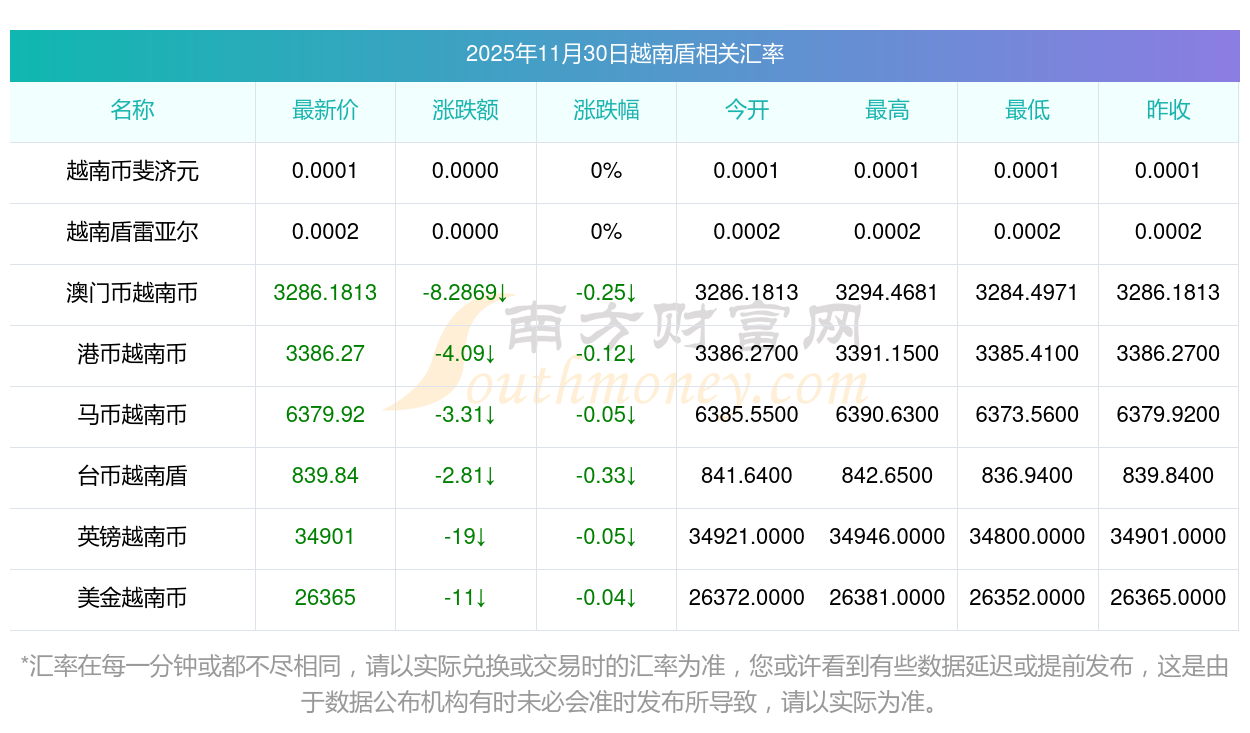 根据2025年11月30日汇率计算,越南盾兑换尼币汇率最新价0.631700,今开价0.6310,昨收价0.6317,最高价0.6326,最低价0.6308。
