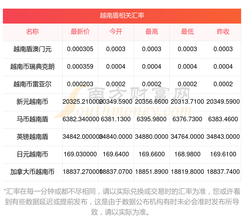 根据2025年12月2日汇率计算,VND兑换MAD汇率最新价0.000351:今开价0.0004,昨收价0.0004,最高价0.0004,最低价0.0004。