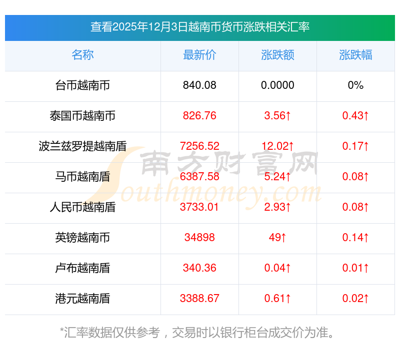 根据2025年12月3日汇率计算,越南币兑换巴西雷亚尔汇率最新价0.000202,今开价0.0002,昨收价0.0002,最高价0.0002,最低价0.0002。