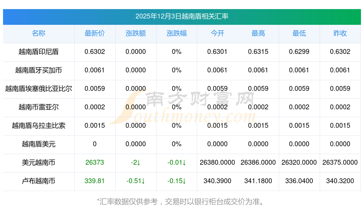2025年12月3日最新消息,越南盾兑换丹麦克朗最新汇率为0.000243,今开为0.0002,昨收为0.0002,最高为0.0002,最低为0.0002。