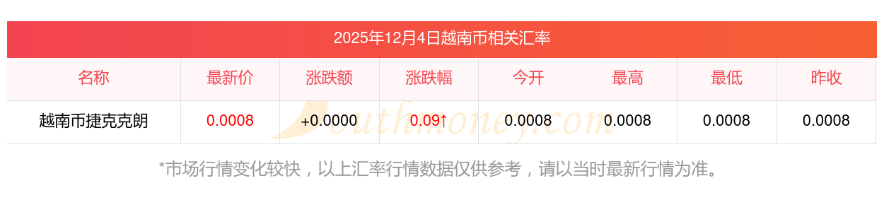 根据2025年12月4日汇率计算,越南币兑换捷克克朗汇率最新价0.000784,今开价0.0008,昨收价0.0008,最高价0.0008,最低价0.0008。