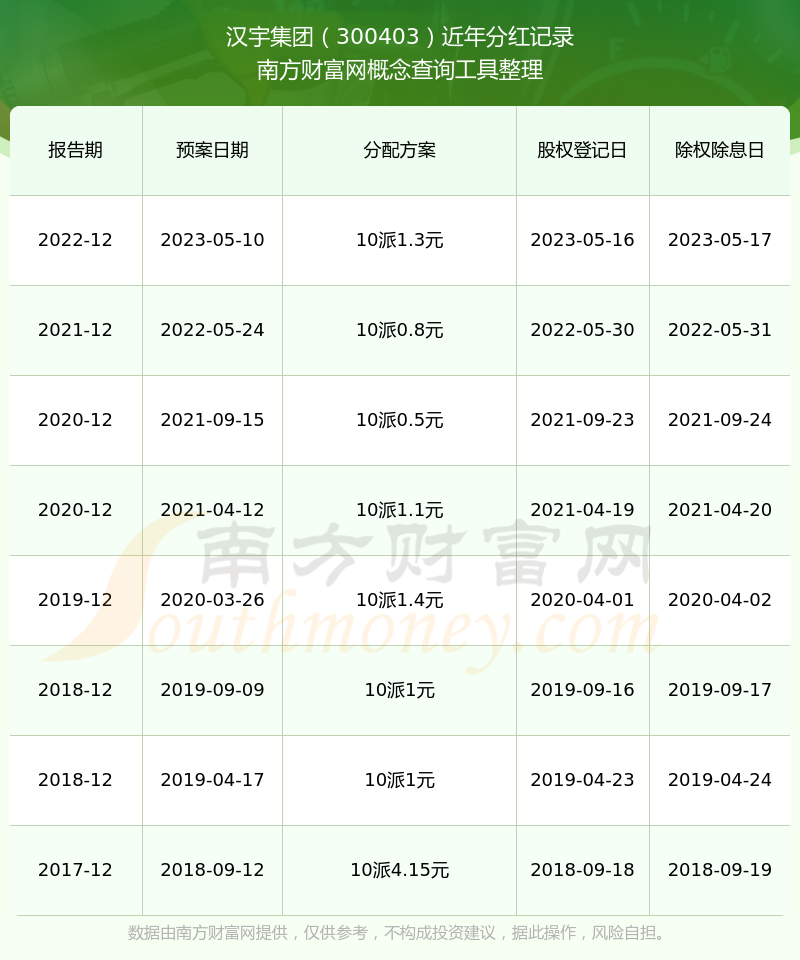 汉宇集团最新一次公布的分红方案为10派1.3元。本次权益分派股权登记日为2023年5月16日,除权除息日为2023年5月17日,派息日为2023年5月17日。