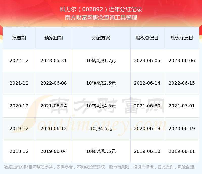 科力尔最新一次公布的分红方案为10转4派1.7元。本次权益分派股权登记日为2023年6月5日,除权除息日为2023年6月6日,派息日为2023年6月6日。