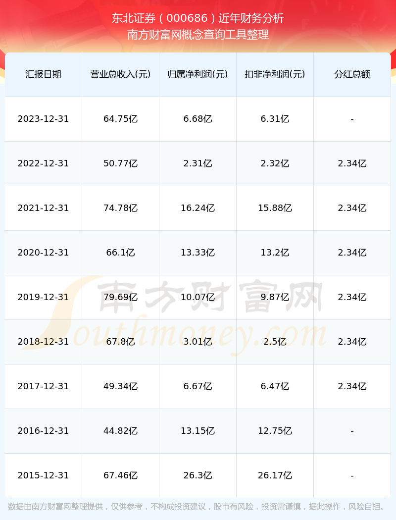 东北证券公司2023年实现营业收入64.75亿元,同比增长27.53%;净利润6.68亿元。