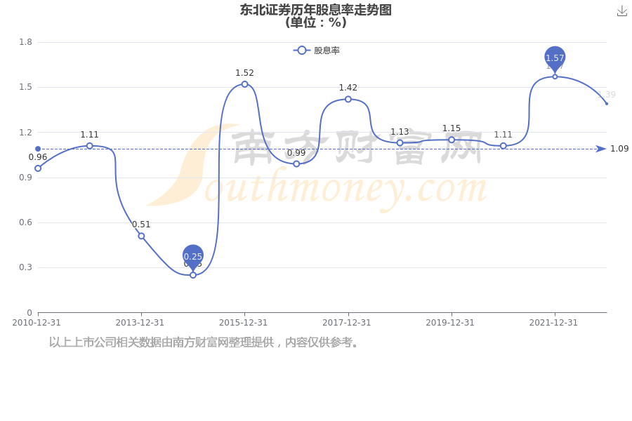 东北证券最新一次公布的分红方案为10派1元。本次权益分派股权登记日为2023年5月30日,除权除息日为2023年5月31日,派息日为2023年5月31日。