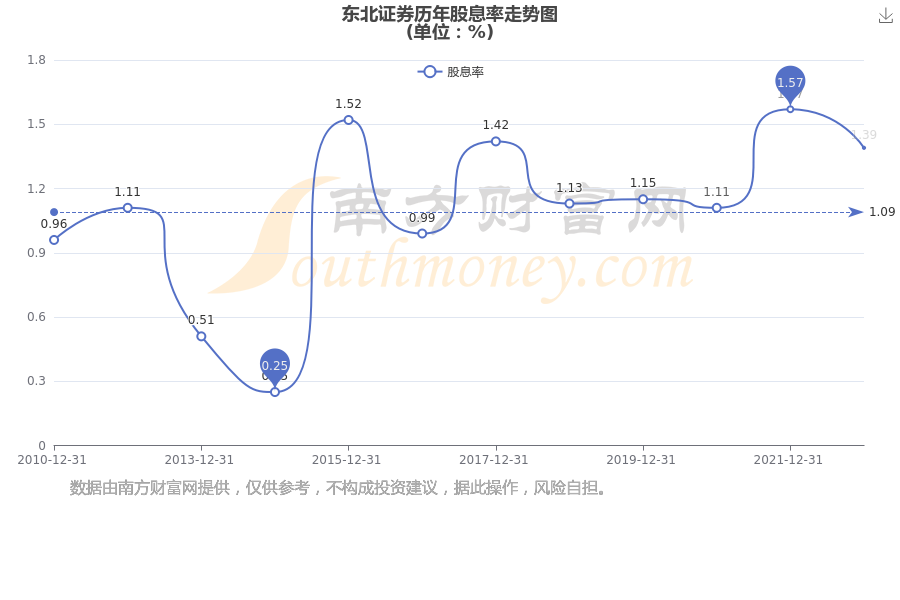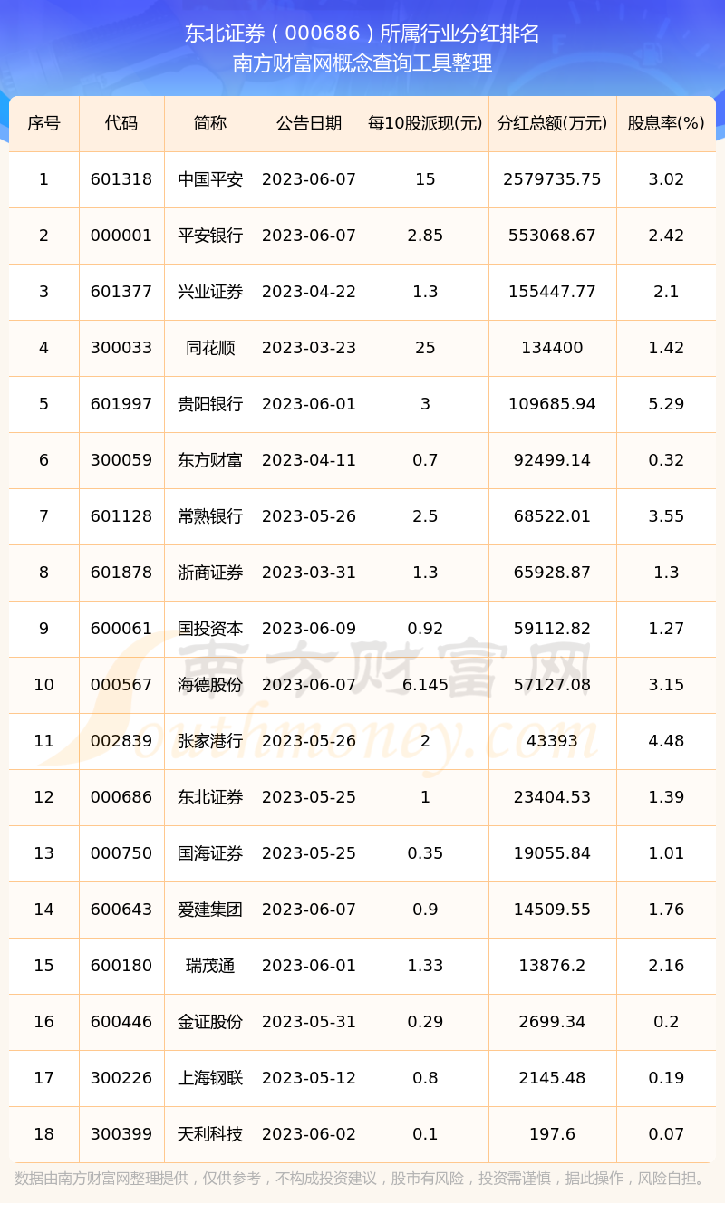 按照南方财富网趋势选股系统统计,东北证券所属行业为证券行业,证券行业分红排名情况如下表: