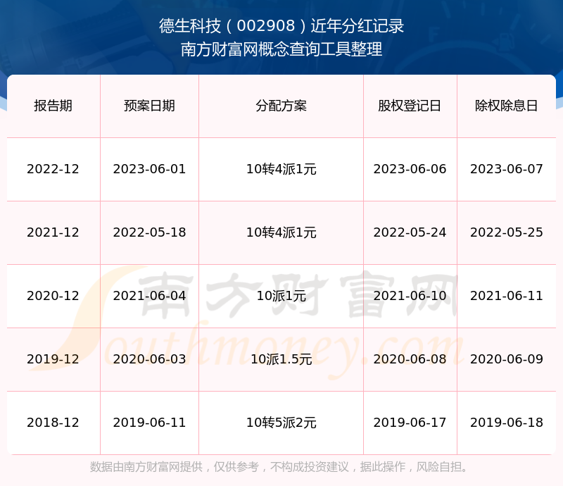 德生科技最新一次公布的分红方案为10转4派1元。本次权益分派股权登记日为2023年6月6日,除权除息日为2023年6月7日,派息日为2023年6月7日。