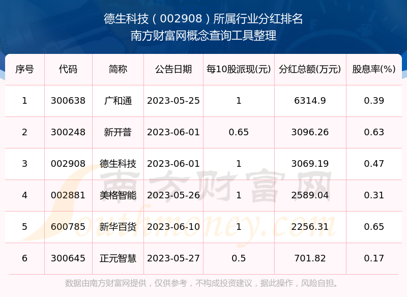 按照南方财富网趋势选股系统统计,德生科技所属行业为通信服务行业,通信服务行业分红排名情况如下表: