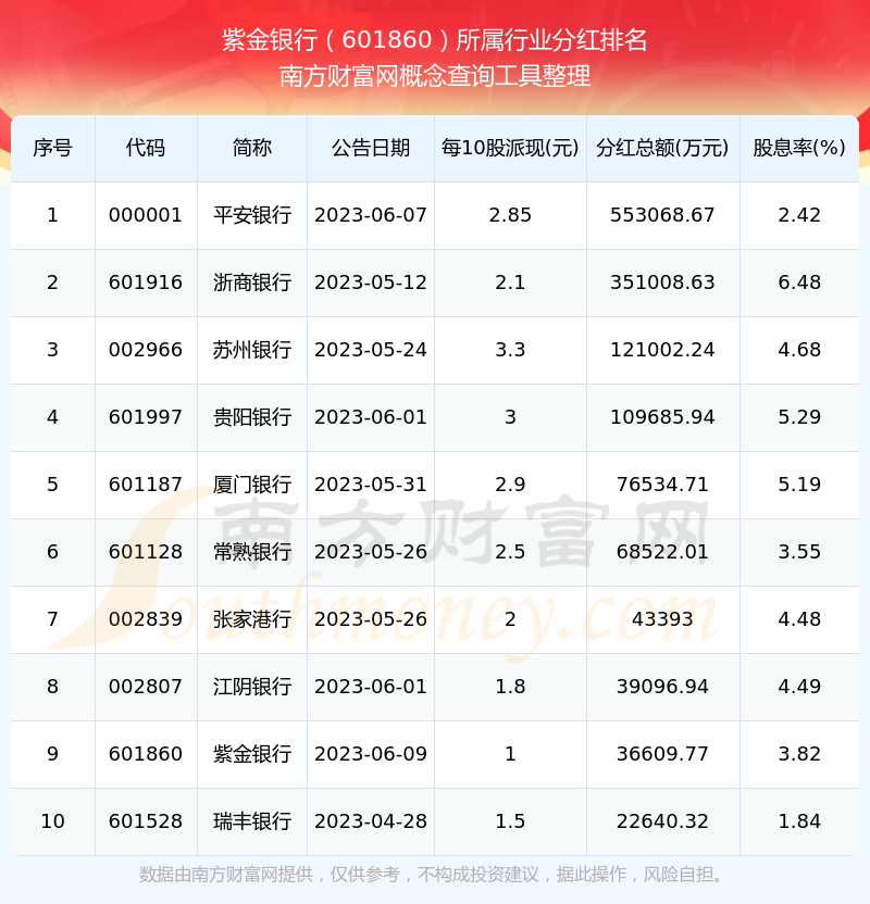 按照南方财富网趋势选股系统统计,紫金银行所属行业为银行行业,银行行业分红排名情况如下表: