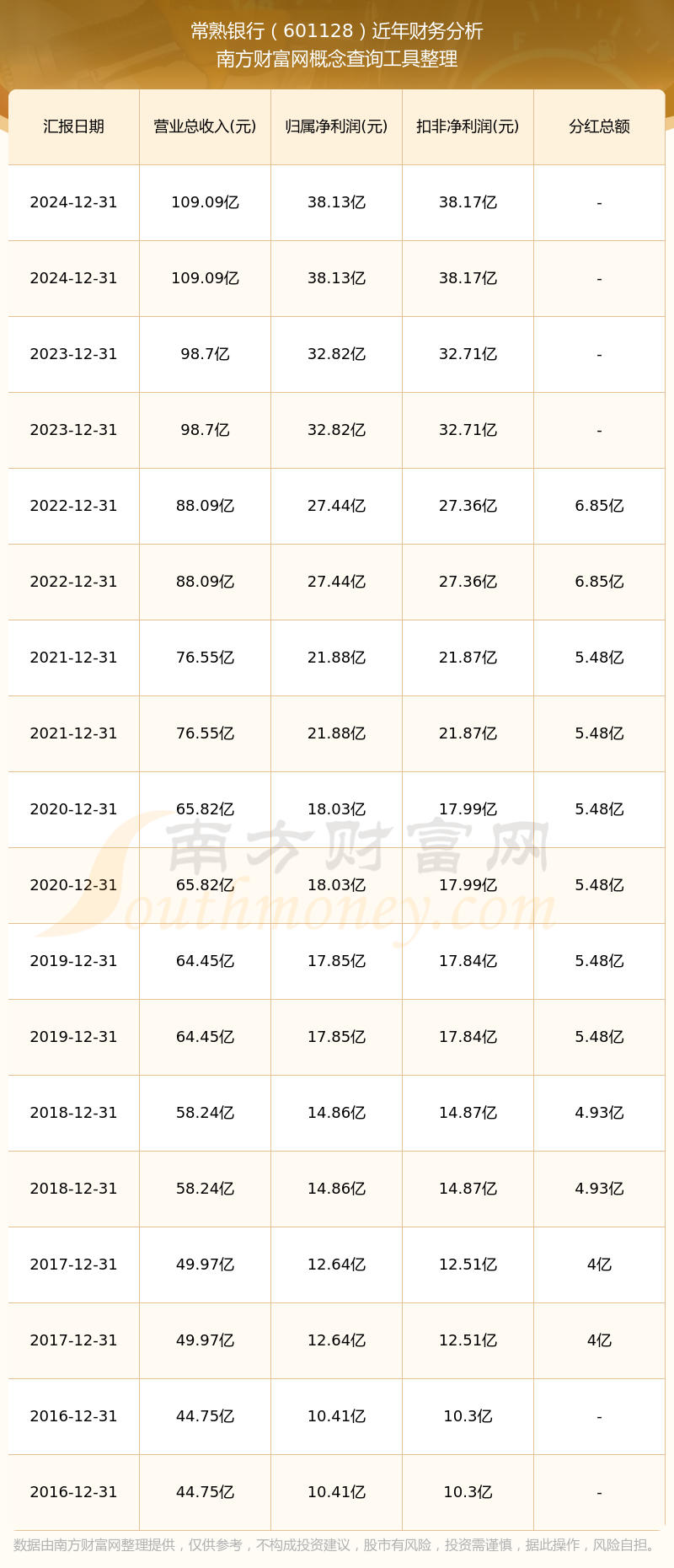 常熟银行2024年总营收109.09亿,同比增长10.53%;净利润38.13亿。