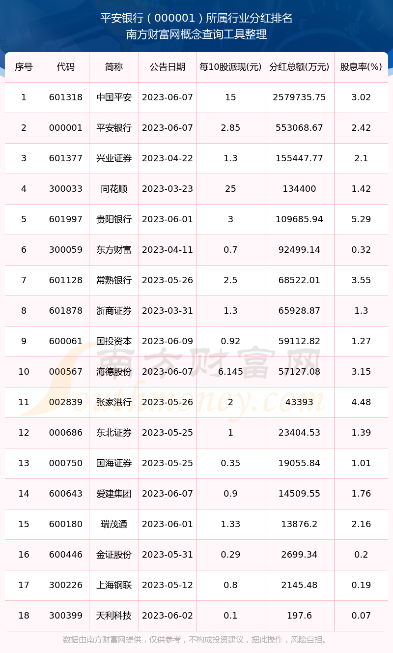 按照南方财富网趋势选股系统统计,平安银行所属行业为银行行业,银行行业分红排名情况如下表: