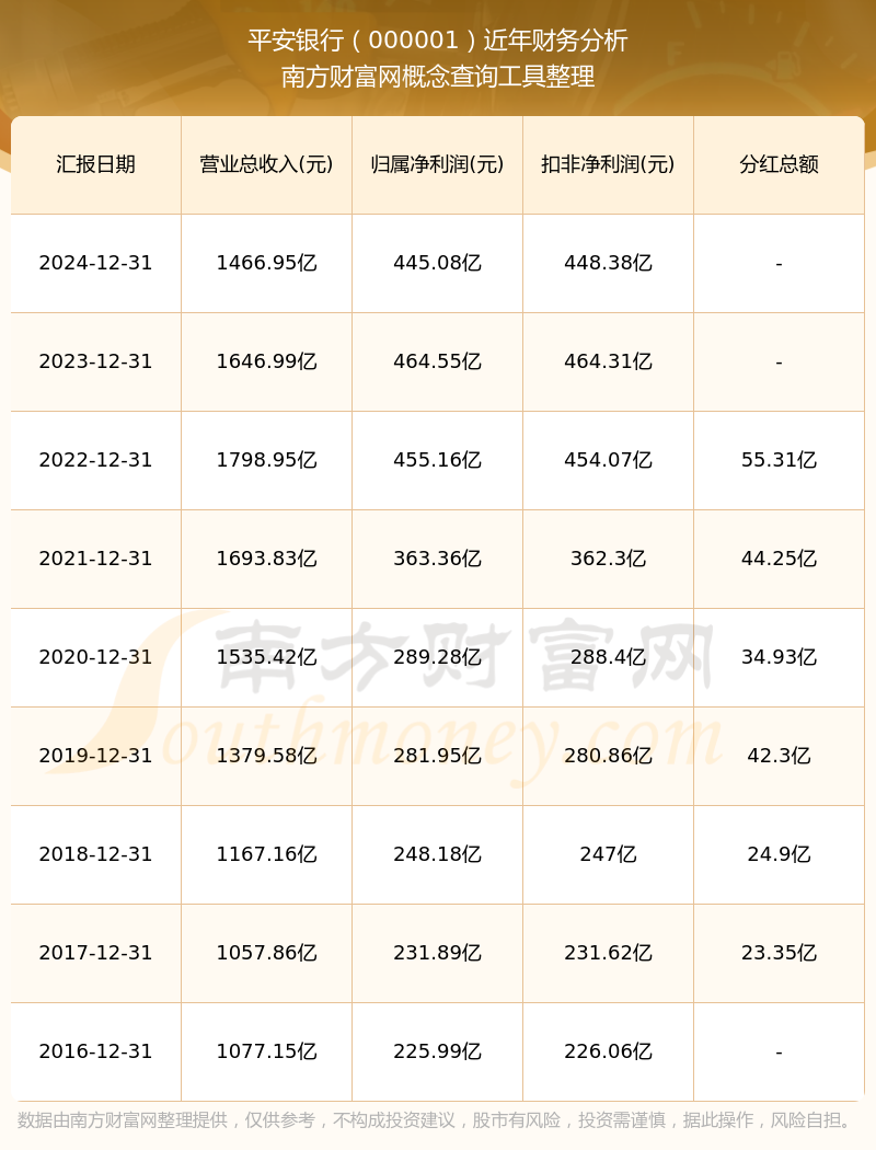 2024年报显示,平安银行实现营收1466.95亿,同比增长-10.93%;净利润445.08亿。