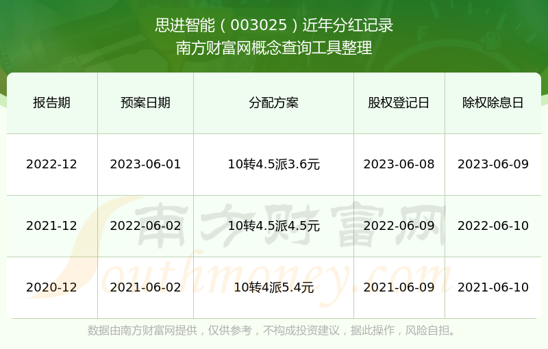 思进智能最新一次公布的分红方案为10转4.5派3.6元。本次权益分派股权登记日为2023年6月8日,除权除息日为2023年6月9日,派息日为2023年6月9日。