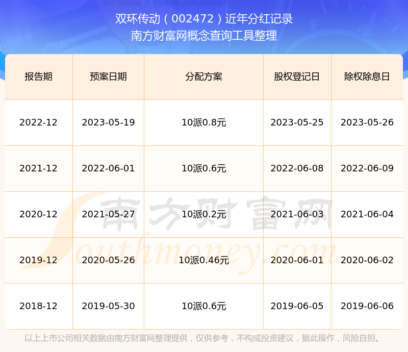 双环传动最新一次公布的分红方案为10派0.8元。本次权益分派股权登记日为2023年5月25日,除权除息日为2023年5月26日,派息日为2023年5月26日。