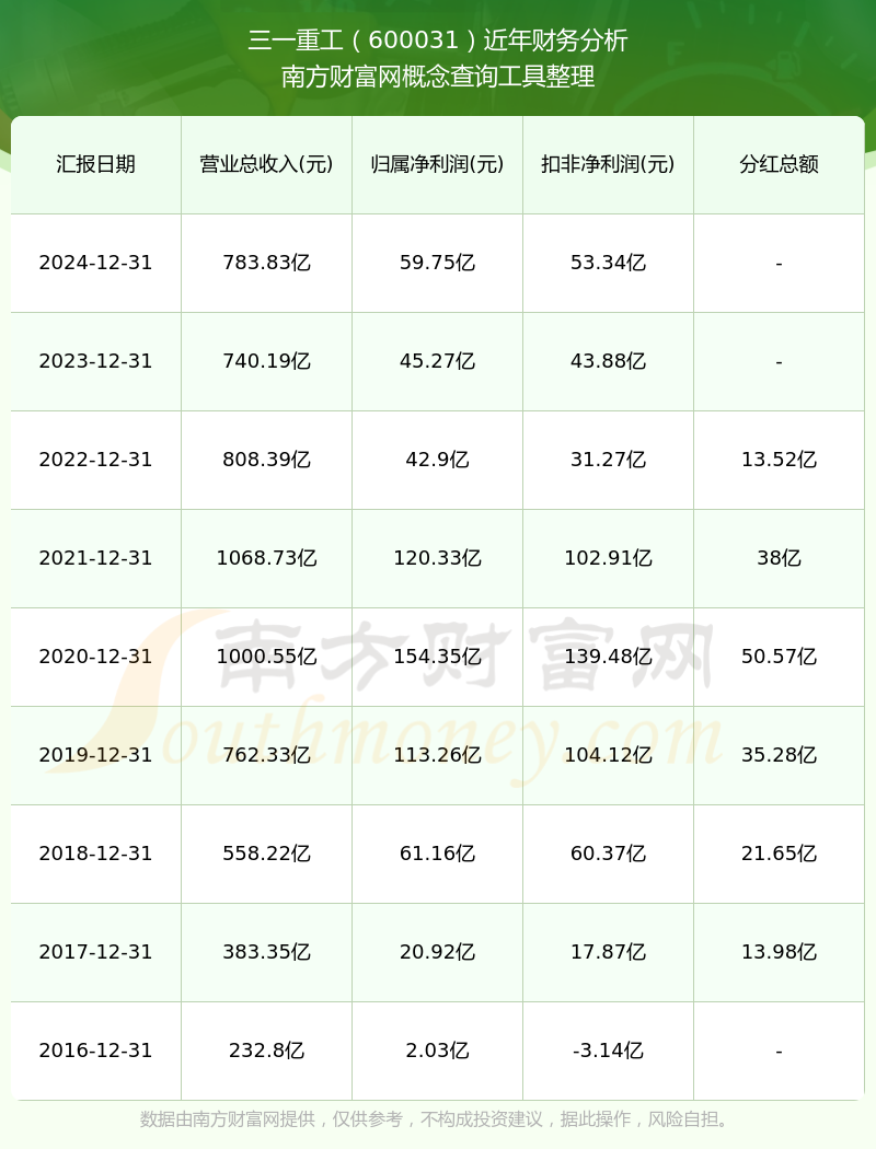 三一重工2024年总营收783.83亿,同比增长5.9%;净利润59.75亿,同比增长31.98%;销售毛利率26.43%。