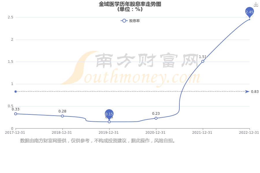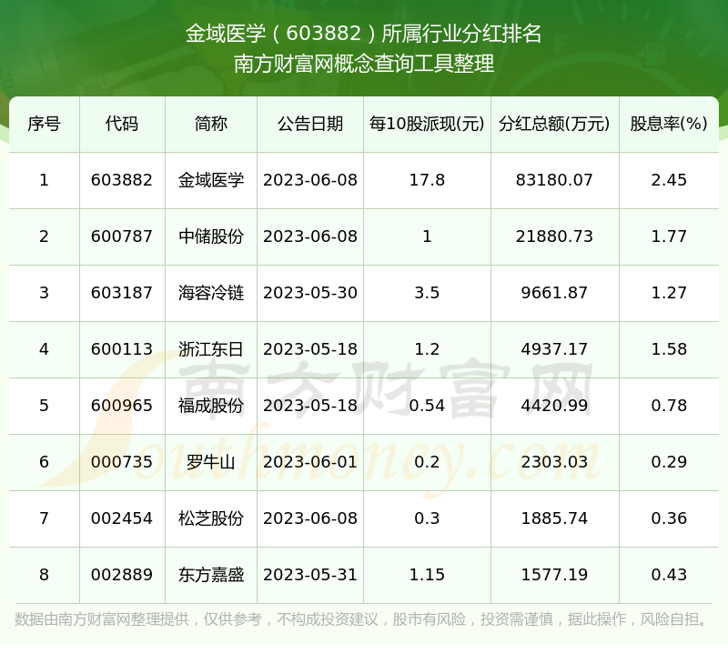 按照南方财富网趋势选股系统统计,金域医学所属行业为医疗服务行业,医疗服务行业分红排名情况如下表: