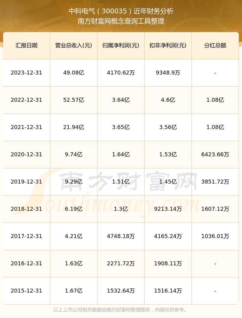 中科电气公司2023年实现营业收入49.08亿元,同比增长-6.64%;净利润4170.62万元,同比增长-88.55%;毛利率15.46%。