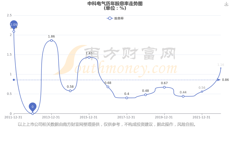 中科电气最新一次公布的分红方案为10派1.5元。本次权益分派股权登记日为2023年5月24日,除权除息日为2023年5月25日,派息日为2023年5月25日。