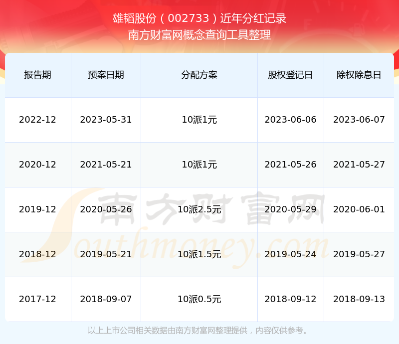 雄韬股份最新一次公布的分红方案为10派1元。本次权益分派股权登记日为2023年6月6日,除权除息日为2023年6月7日,派息日为2023年6月7日。