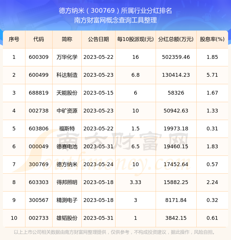 按照南方财富网趋势选股系统统计,德方纳米所属行业为纳米磷酸铁锂行业,纳米磷酸铁锂行业分红排名情况如下表: