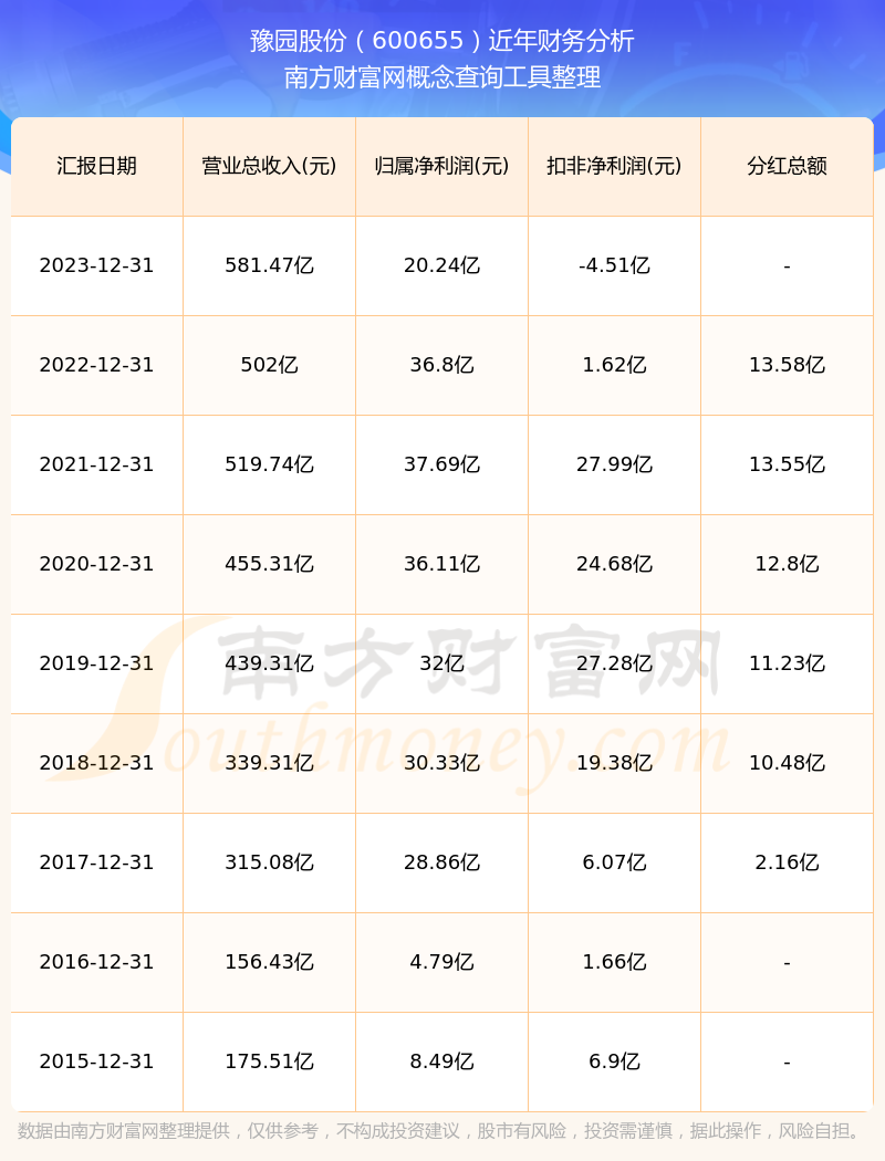 2023年报显示,豫园股份实现营收581.47亿,同比增长15.83%;净利润20.24亿,同比增长-45%;毛利率14.11%。