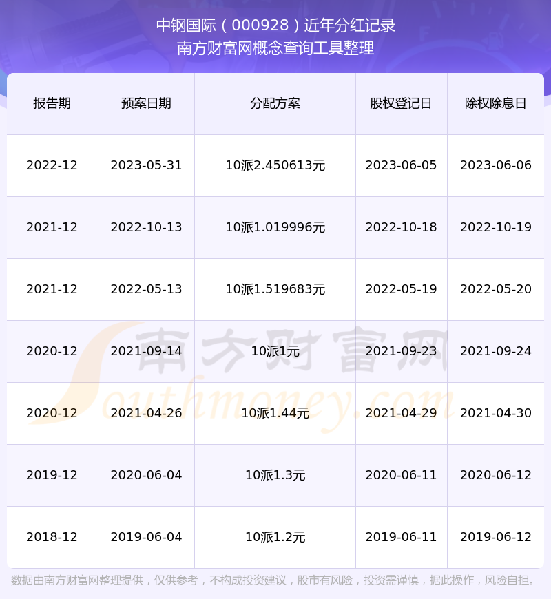 中钢国际最新一次公布的分红方案为10派2.450613元。本次权益分派股权登记日为2023年6月5日,除权除息日为2023年6月6日,派息日为2023年6月6日。