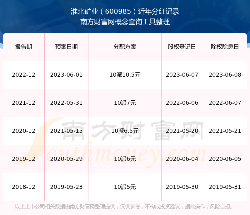 淮北矿业最新一次公布的分红方案为10派10.5元。本次权益分派股权登记日为2023年6月7日,除权除息日为2023年6月8日,派息日为2023年6月8日。