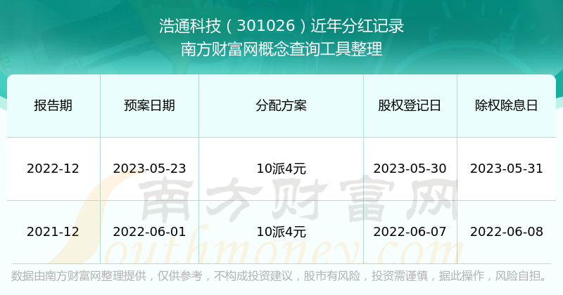 浩通科技最新一次公布的分红方案为10派4元。本次权益分派股权登记日为2023年5月30日,除权除息日为2023年5月31日,派息日为2023年5月31日。