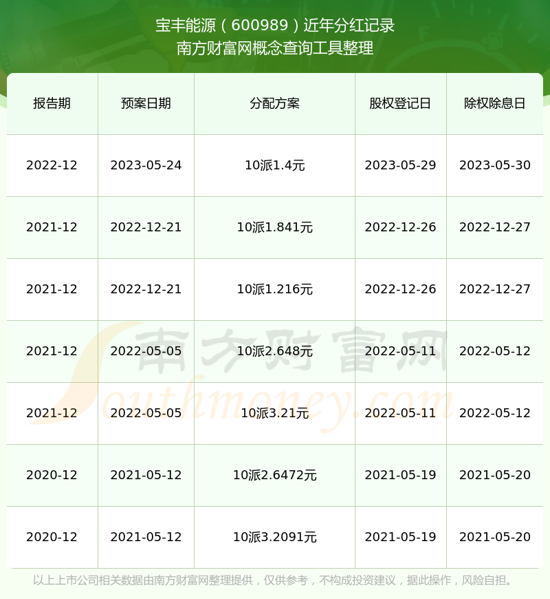 宝丰能源最新一次公布的分红方案为10派1.4元。本次权益分派股权登记日为2023年5月29日,除权除息日为2023年5月30日,派息日为2023年5月30日。