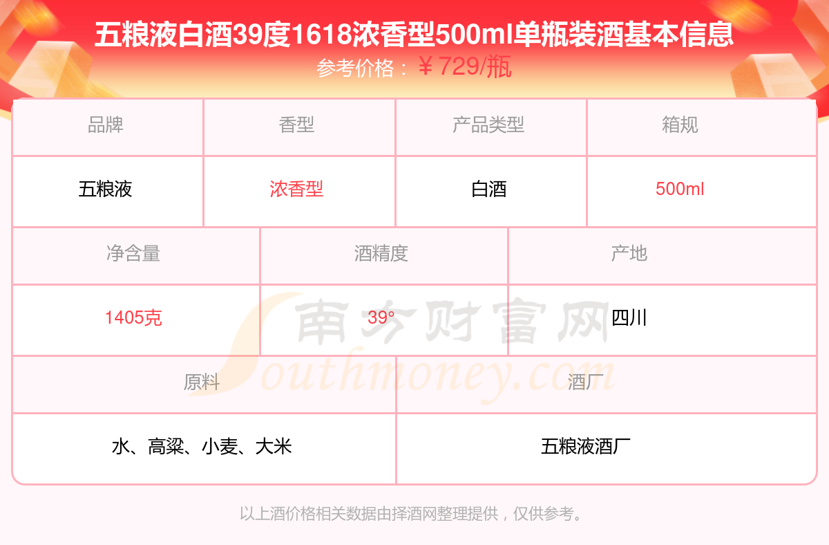 五粮液白酒39度1618浓香型500ml单瓶装基本信息