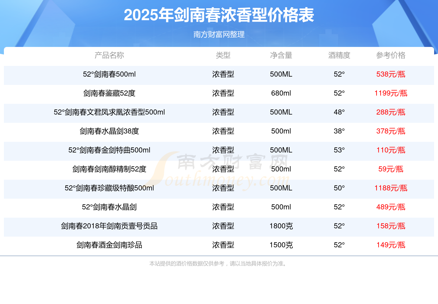 剑南春浓香型酒最新价格2025:剑南春鉴藏52度参考价1199元/瓶、52°剑南春珍藏级特酿500ml参考价1188元/瓶、剑南春酒东方红1949参考价1099元/瓶、52°剑南春500ml参考价538元/瓶、52°剑南春水晶剑参考价489元/瓶、剑南春水晶剑38度参考价378元/瓶、52°剑南春文君凤求凰浓香型500ml参考价288元/瓶。