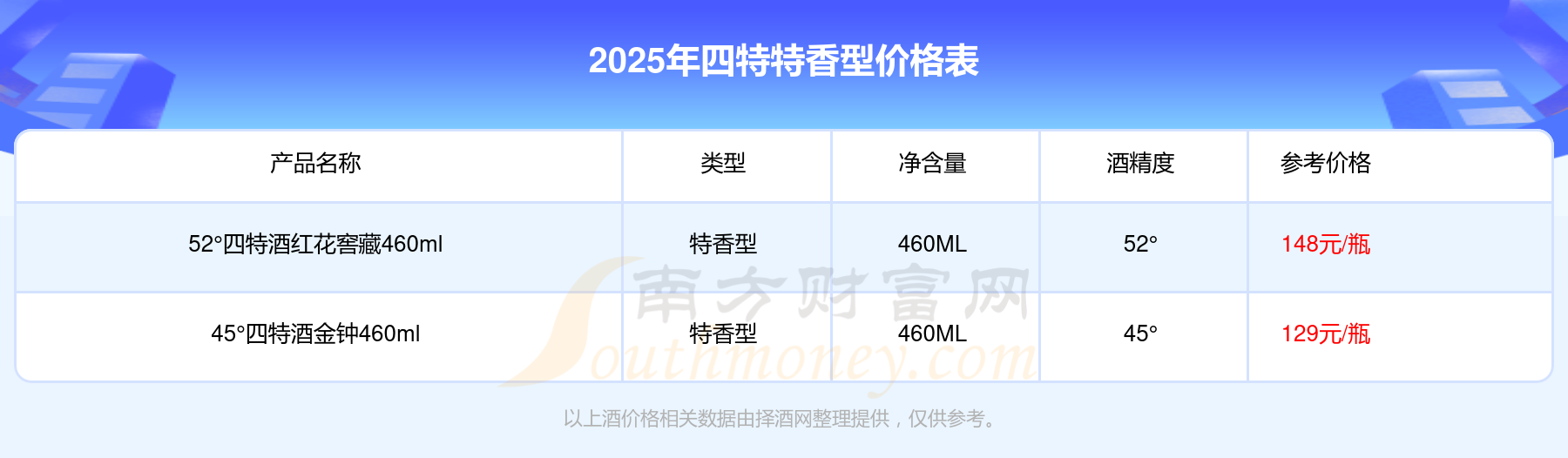 2025年,52°四特酒红花窖藏460ml、45°四特酒金钟460ml等四特特香型酒价格如下: