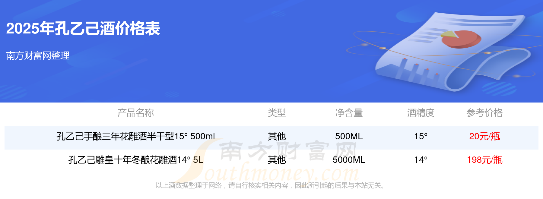 孔乙己雕皇十年冬酿花雕酒14° 5L参考价198元/瓶、孔乙己手酿三年花雕酒半干型15° 500ml参考价20元/瓶。