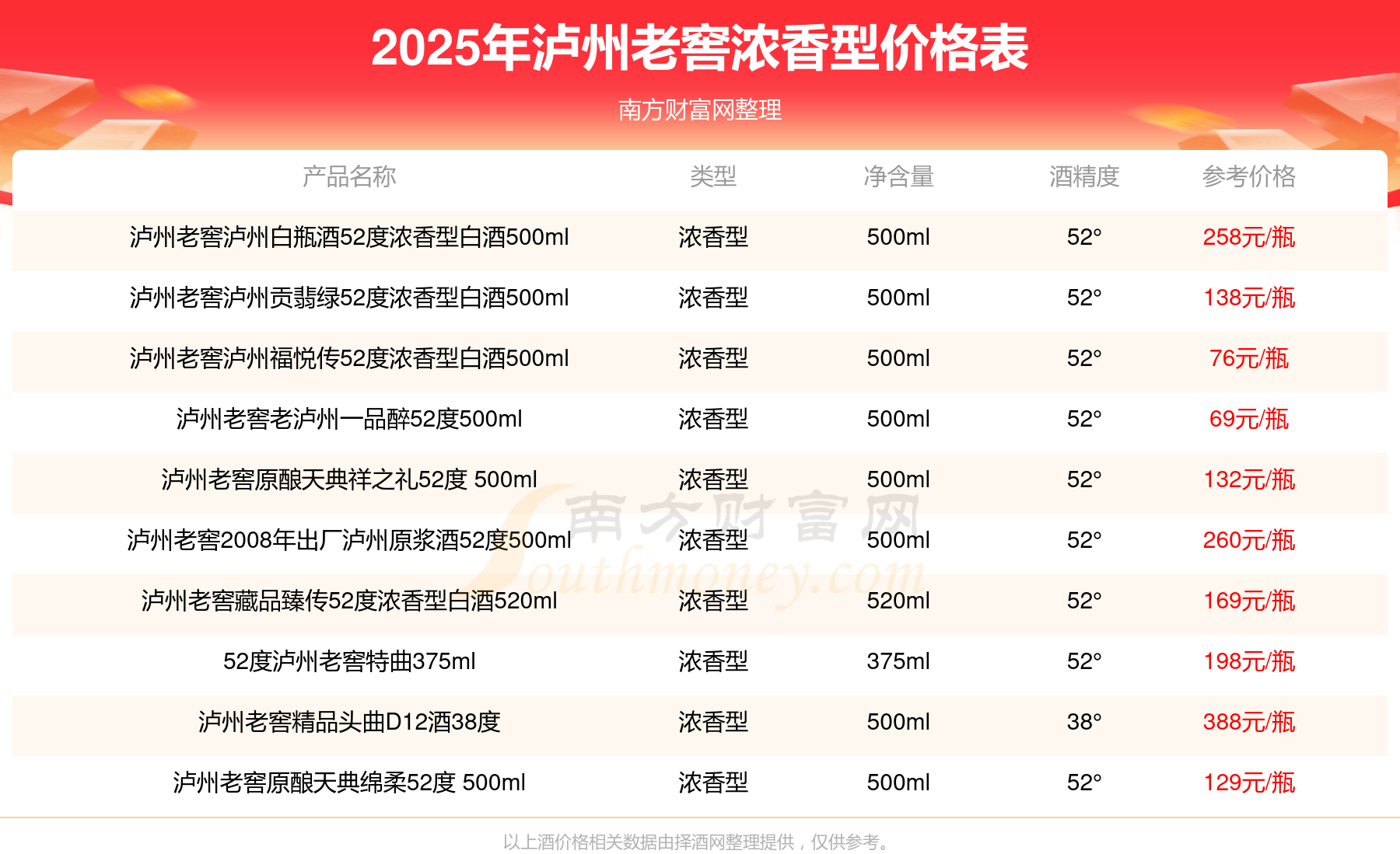 2025泸州老窖浓香型酒最新价格:泸州老窖国窖1573春酿鼠兆丰年E 55度参考价17999元/瓶、泸州老窖国窖1573生命中的那坛酒55度014参考价9999元/瓶、泸州老窖国窖1573春酿鼠兆丰年A 55度参考价5088元/瓶、泸州老窖国窖1573生命中的那坛酒55度013浓香型白酒1000ml参考价4988元/瓶、泸州老窖国窖1573生命中的那坛酒55度009 1000ml参考价4288元/瓶、泸州老窖国窖1573中国品味52度浓香型白酒500ml参考价2888元/瓶、泸州老窖国窖1573许燎源概念作品58度浓香型白酒1000ml参考价2680元/瓶、泸州老窖52度国窖1573狗年生肖礼盒参考价2143元/瓶。