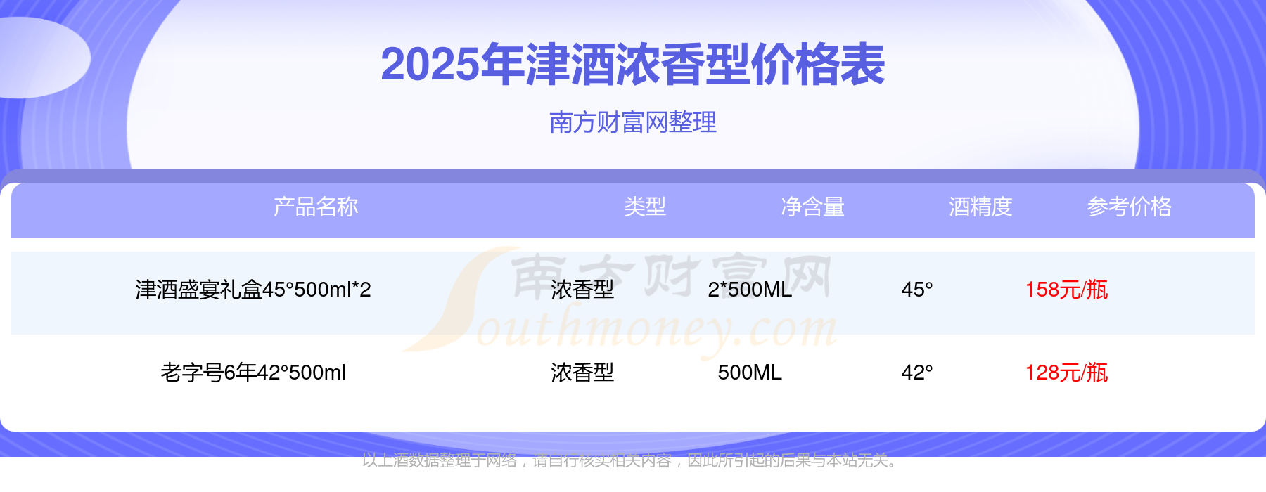 2025年津酒浓香型酒津酒盛宴礼盒45°500ml*2、老字号6年42°500ml等最新价格如下:津酒盛宴礼盒45°500ml*2参考价158元/瓶、老字号6年42°500ml参考价128元/瓶。