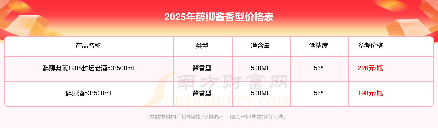 2025年,醉卿酱香型酒价格最高的是醉卿典藏1988封坛老酒53°500ml,参考价226元,最低的是醉卿酒53°500ml,参考价198元,价格高低差为28元。