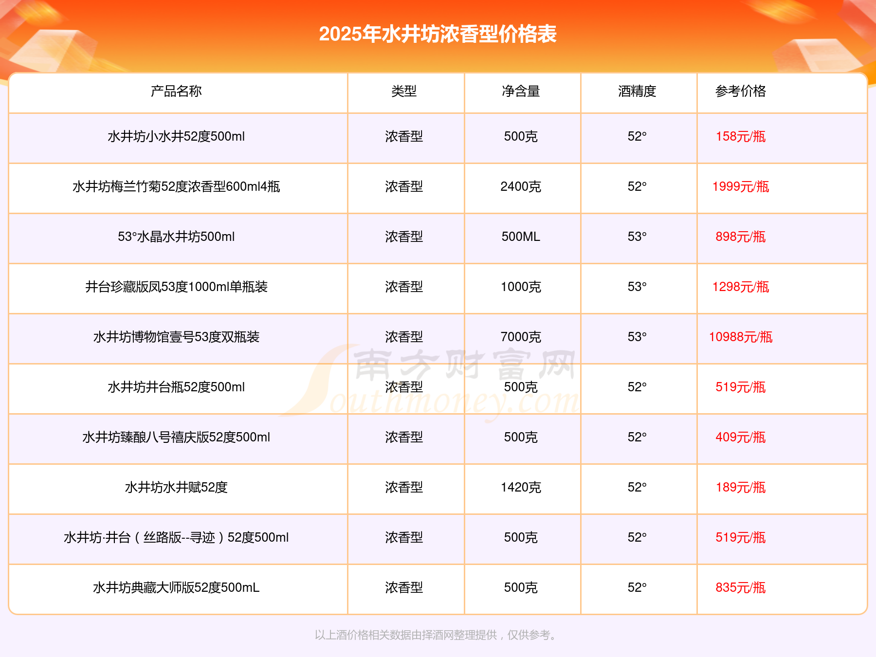 2025水井坊浓香型酒最新价格:水井坊大坛收藏级原浆天球瓶66度参考价13999元/瓶、水井坊博物馆壹号53度双瓶装参考价10988元/瓶、53°水井坊公元十三600ml参考价2580元/瓶。