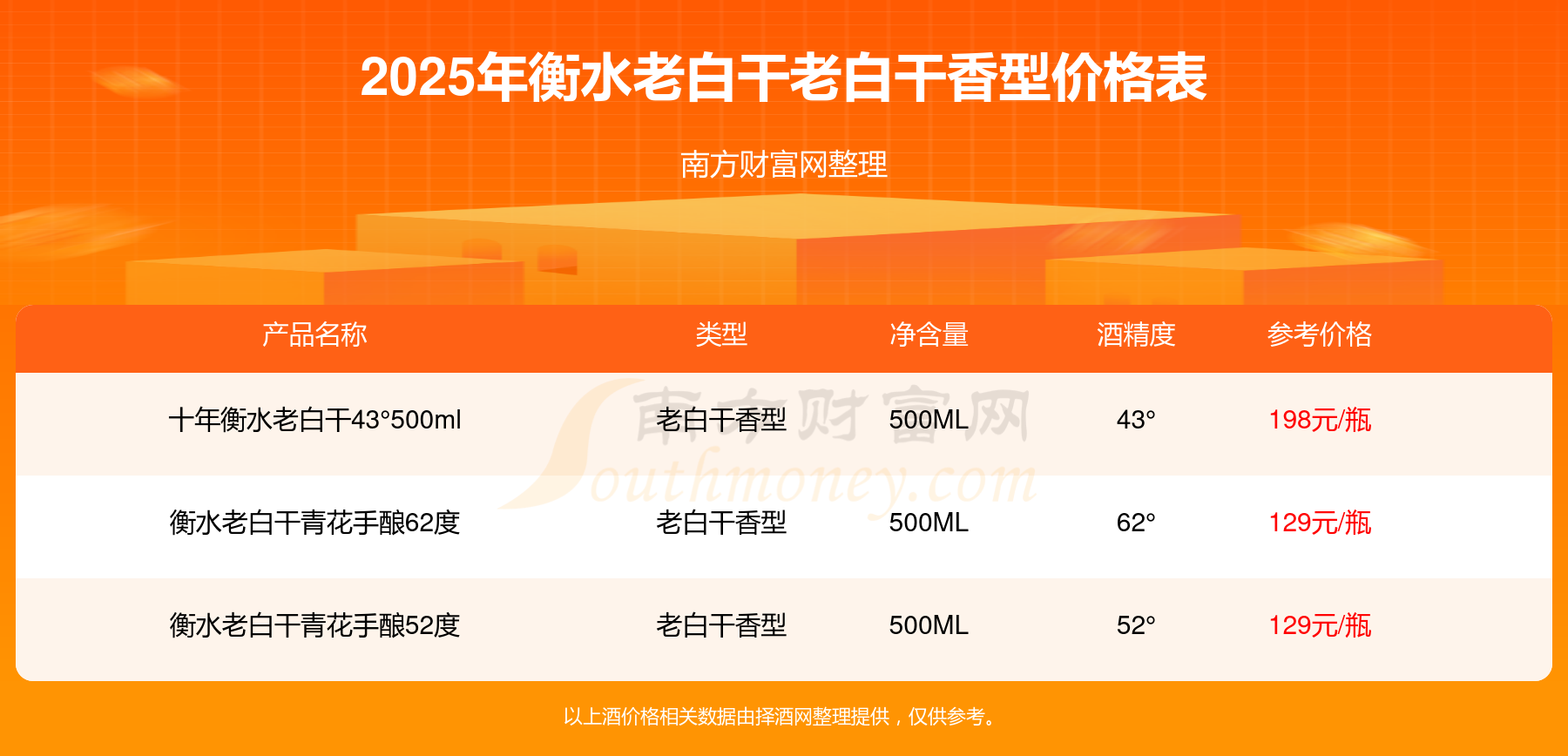 十年衡水老白干43°500ml参考价198元/瓶、衡水老白干青花手酿52度参考价129元/瓶、衡水老白干青花手酿62度参考价129元/瓶。