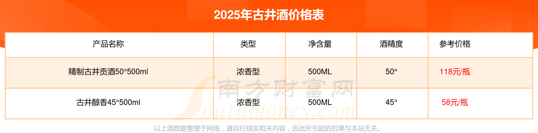 2025年,古井酒价格最高的是精制古井贡酒50°500ml,参考价118元,最低的是古井醇香45°500ml,参考价58元,价格高低差为60元。