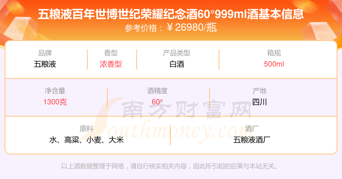 五粮液百年世博世纪荣耀纪念酒60°999ml基本信息