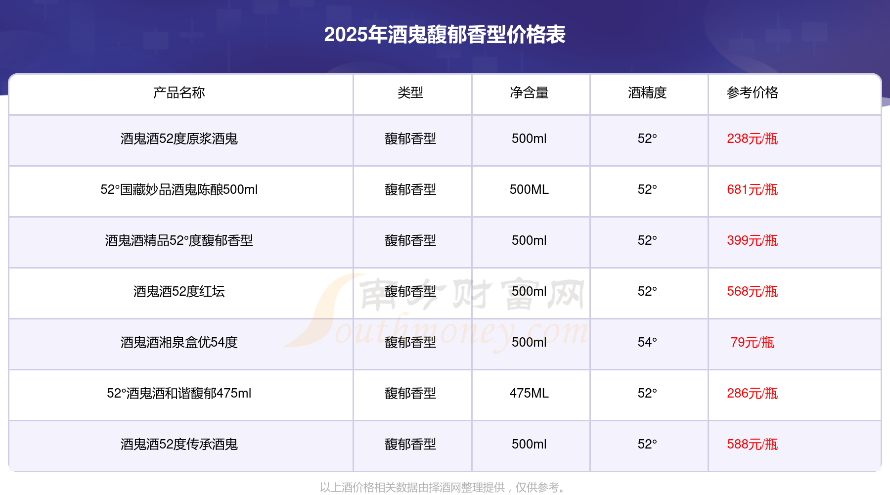 2025年酒鬼馥郁香型酒52°国藏妙品酒鬼陈酿500ml、酒鬼酒52度传承酒鬼、酒鬼酒52度红坛、酒鬼酒精品52°度馥郁香型、52°酒鬼酒和谐馥郁475ml、酒鬼酒52度原浆酒鬼等最新价格如下: