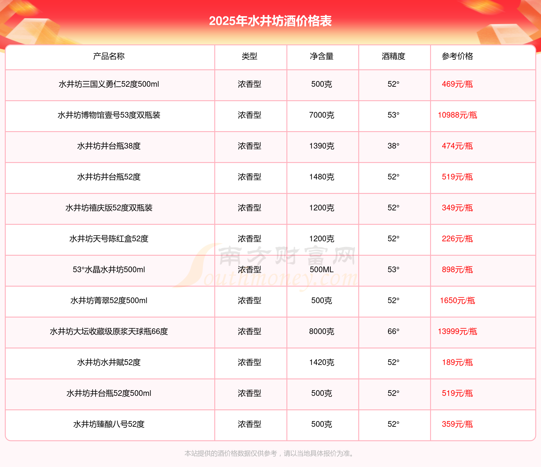 水井坊酒最新价格2025:水井坊大坛收藏级原浆天球瓶66度参考价13999元/瓶、水井坊博物馆壹号53度双瓶装参考价10988元/瓶、53°水井坊公元十三600ml参考价2580元/瓶、水井坊梅兰竹菊52度浓香型600ml4瓶参考价1999元/瓶、水井坊菁翠52度500ml参考价1650元/瓶。