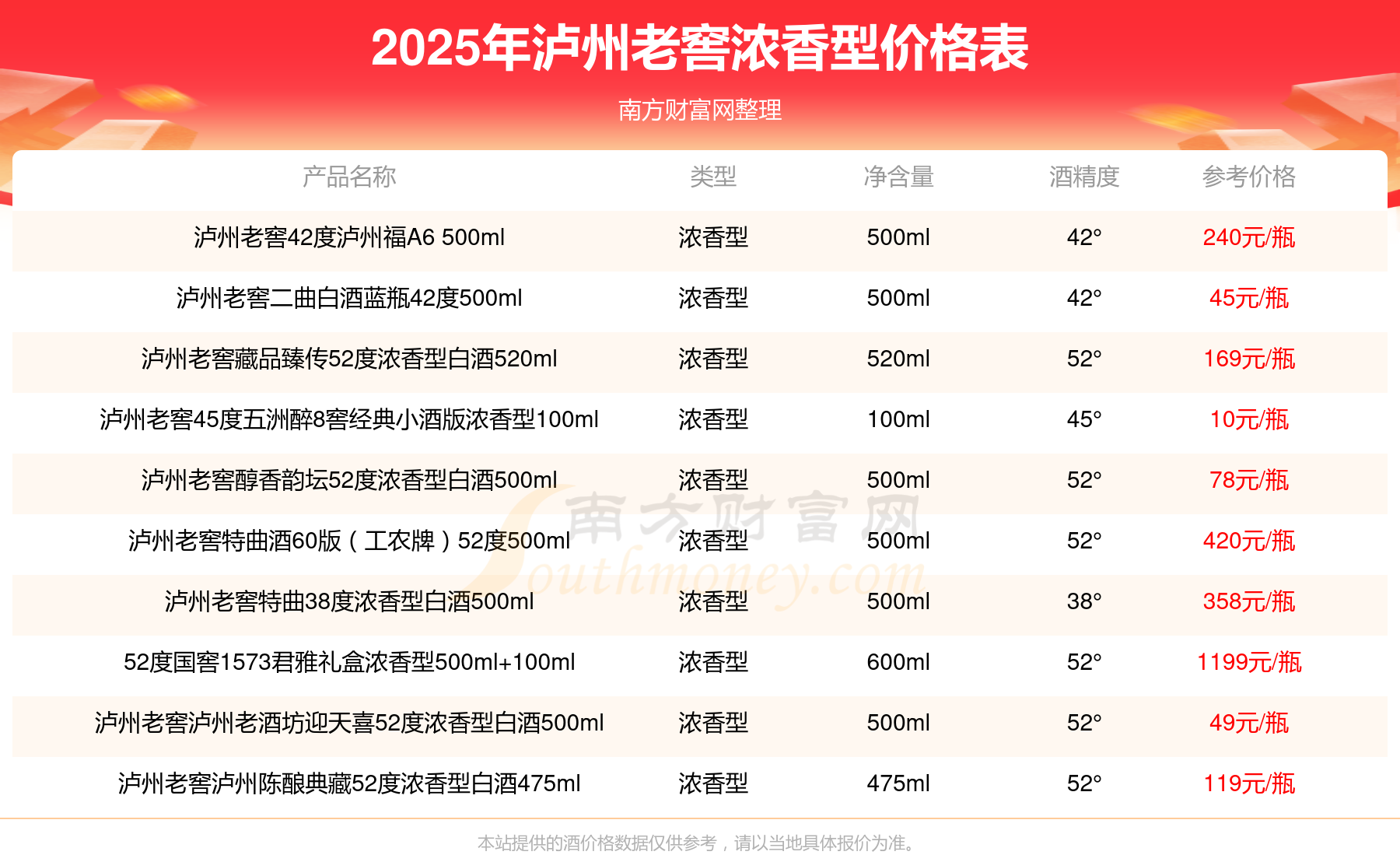 2025泸州老窖浓香型酒最新价格:泸州老窖国窖1573春酿鼠兆丰年E 55度参考价17999元/瓶、泸州老窖国窖1573生命中的那坛酒55度014参考价9999元/瓶、泸州老窖国窖1573春酿鼠兆丰年A 55度参考价5088元/瓶、泸州老窖国窖1573生命中的那坛酒55度013浓香型白酒1000ml参考价4988元/瓶、泸州老窖国窖1573生命中的那坛酒55度009 1000ml参考价4288元/瓶、泸州老窖国窖1573中国品味52度浓香型白酒500ml参考价2888元/瓶。