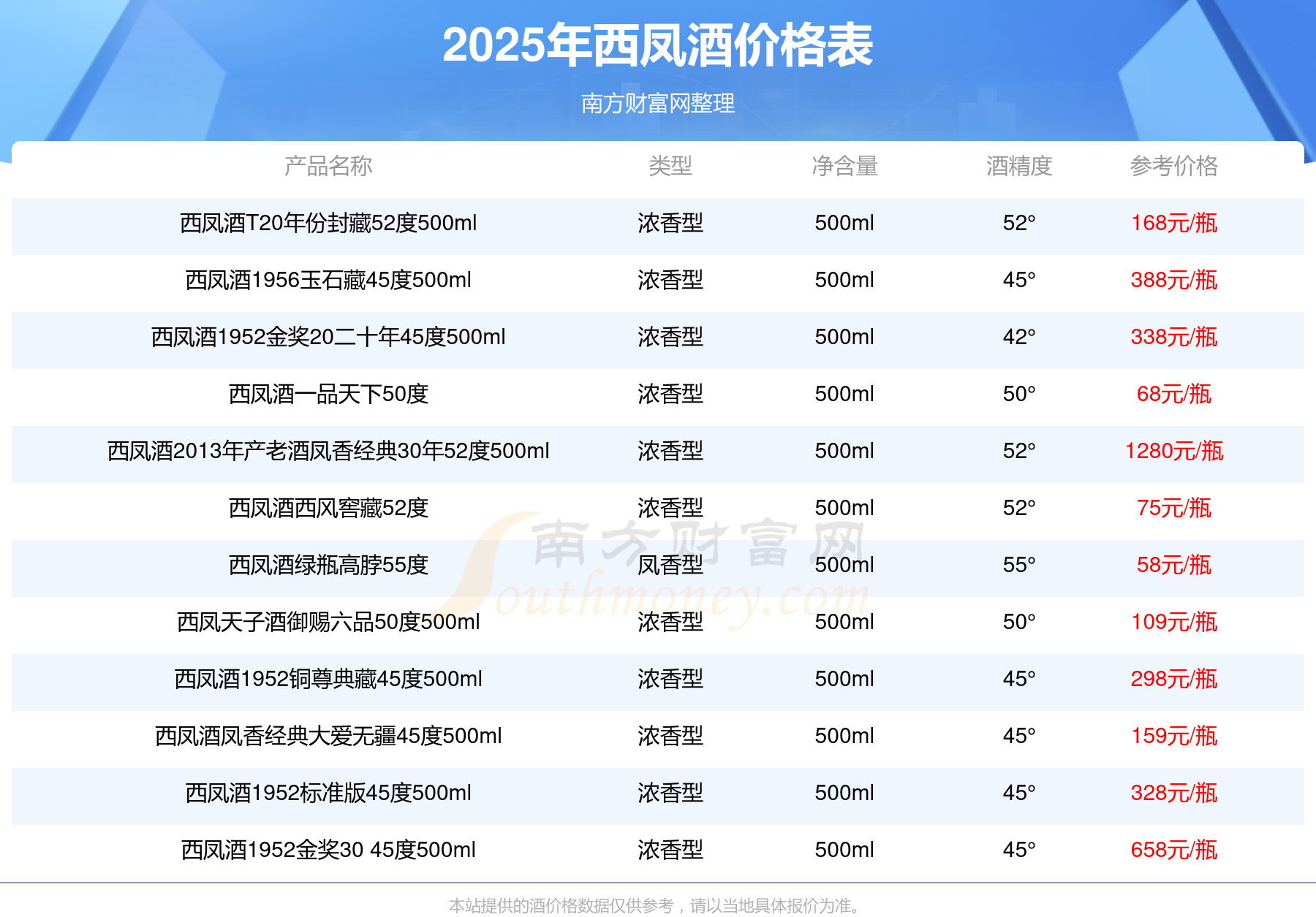 2025年,西凤酒 酒海私藏55度3000ml、西凤酒1952金奖50 55度500ml、西凤酒2013年产老酒凤香经典30年52度500ml、西凤酒1956钻石藏45度500ml、西凤酒1952金奖30 55度500ml、西凤酒凤香经典20年52度500ml、西凤酒1952金奖30 45度500ml、西凤酒1956纪念版52度500ml等西凤酒价格如下:西凤酒 酒海私藏55度3000ml参考价8880元/瓶、西凤酒1952金奖50 55度500ml参考价2380元/瓶、西凤酒2013年产老酒凤香经典30年52度500ml参考价1280元/瓶、西凤酒1956钻石藏45度500ml参考价980元/瓶、西凤酒1952金奖30 55度500ml参考价898元/瓶、西凤酒凤香经典20年52度500ml参考价768元/瓶、西凤酒1952金奖30 45度500ml参考价658元/瓶、西凤酒1956纪念版52度500ml参考价498元/瓶。
