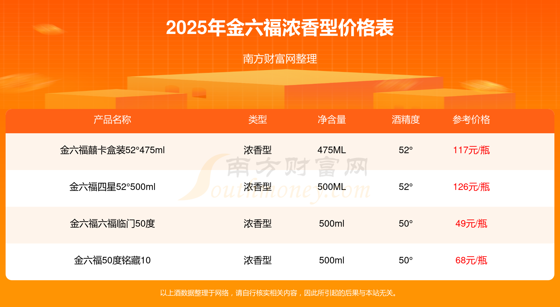金六福四星52°500ml参考价126元/瓶、金六福囍卡盒装52°475ml参考价117元/瓶、金六福50度铭藏10参考价68元/瓶、金六福六福临门50度参考价49元/瓶。