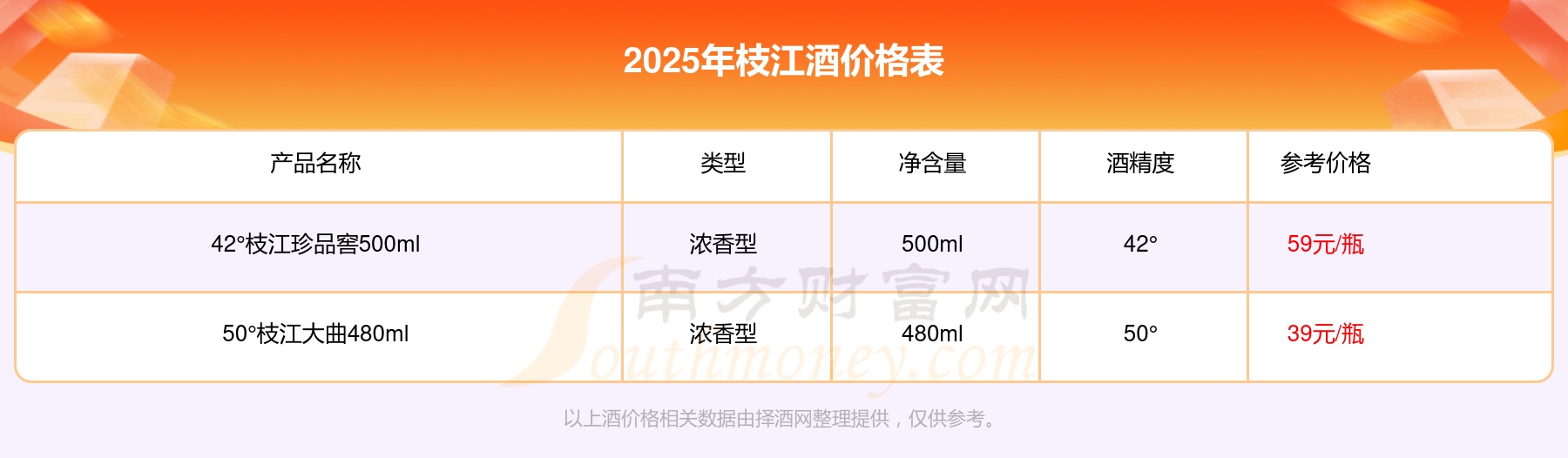 2025年枝江酒42°枝江珍品窖500ml、50°枝江大曲480ml等最新价格如下:42°枝江珍品窖500ml参考价59元/瓶、50°枝江大曲480ml参考价39元/瓶。
