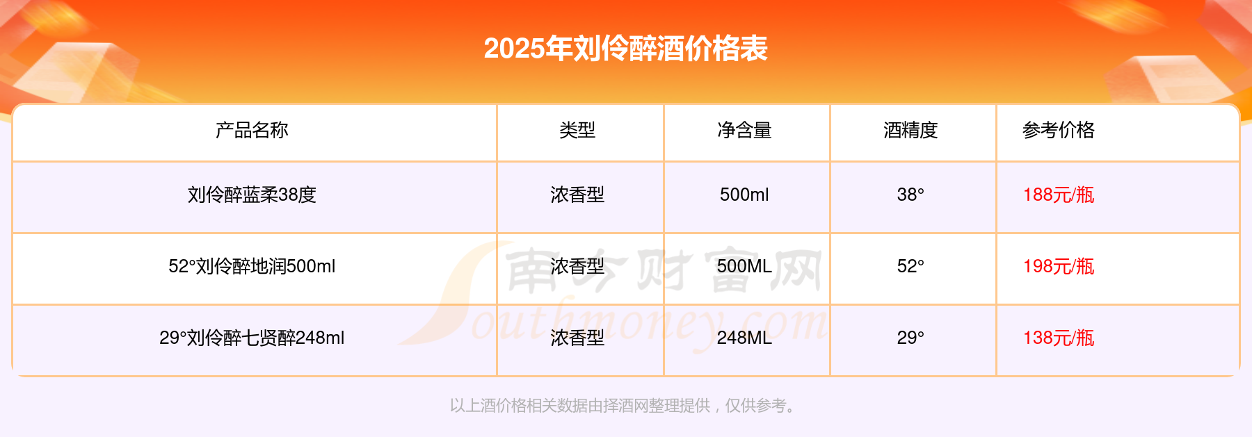 2025刘伶醉酒最新价格:52°刘伶醉地润500ml参考价198元/瓶、刘伶醉蓝柔38度参考价188元/瓶、29°刘伶醉七贤醉248ml参考价138元/瓶。