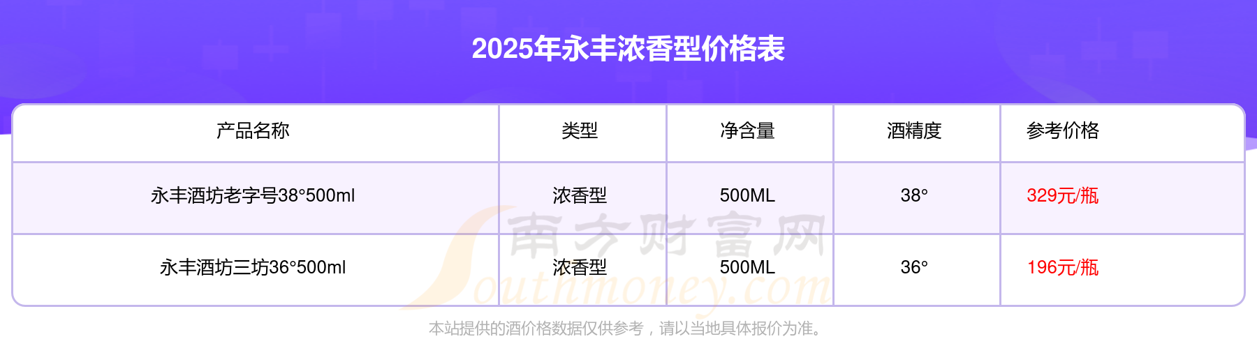 永丰酒坊老字号38°500ml参考价329元/瓶、永丰酒坊三坊36°500ml参考价196元/瓶。