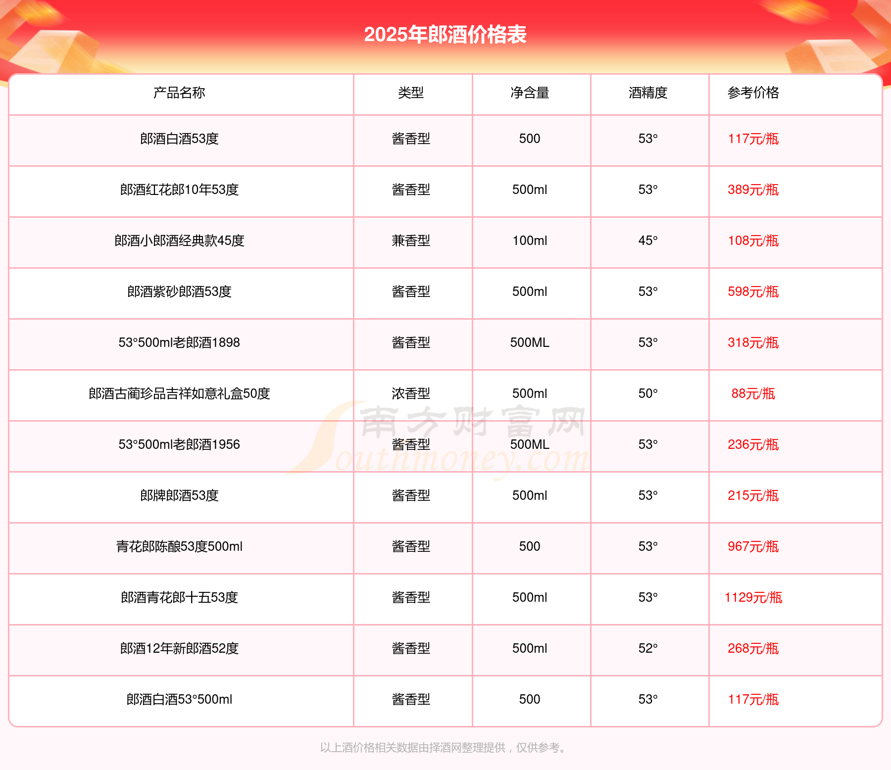 2025年,郎酒青花郎十五53度、青花郎陈酿53度500ml、郎酒紫砂郎酒53度、郎酒红花郎10年53度、53°500ml老郎酒1898、郎酒12年新郎酒52度、53°500ml老郎酒1956、郎牌郎酒53度等郎酒价格如下:郎酒青花郎十五53度参考价1129元/瓶、青花郎陈酿53度500ml参考价967元/瓶、郎酒紫砂郎酒53度参考价598元/瓶、郎酒红花郎10年53度参考价389元/瓶、53°500ml老郎酒1898参考价318元/瓶、郎酒12年新郎酒52度参考价268元/瓶、53°500ml老郎酒1956参考价236元/瓶、郎牌郎酒53度参考价215元/瓶。