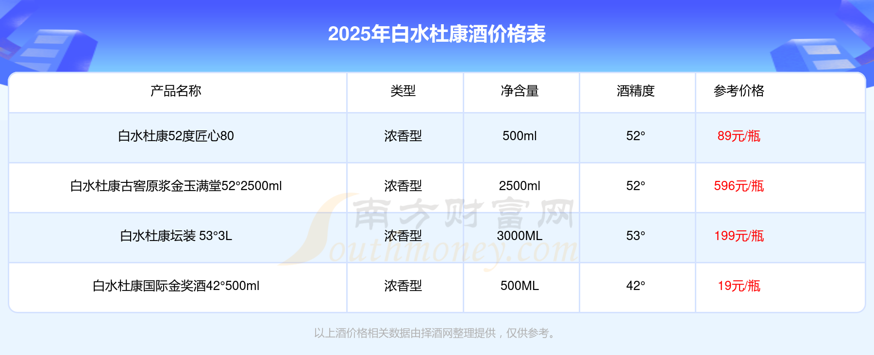 白水杜康古窖原浆金玉满堂52°2500ml参考价596元/瓶、白水杜康坛装 53°3L参考价199元/瓶、白水杜康52度匠心80参考价89元/瓶。